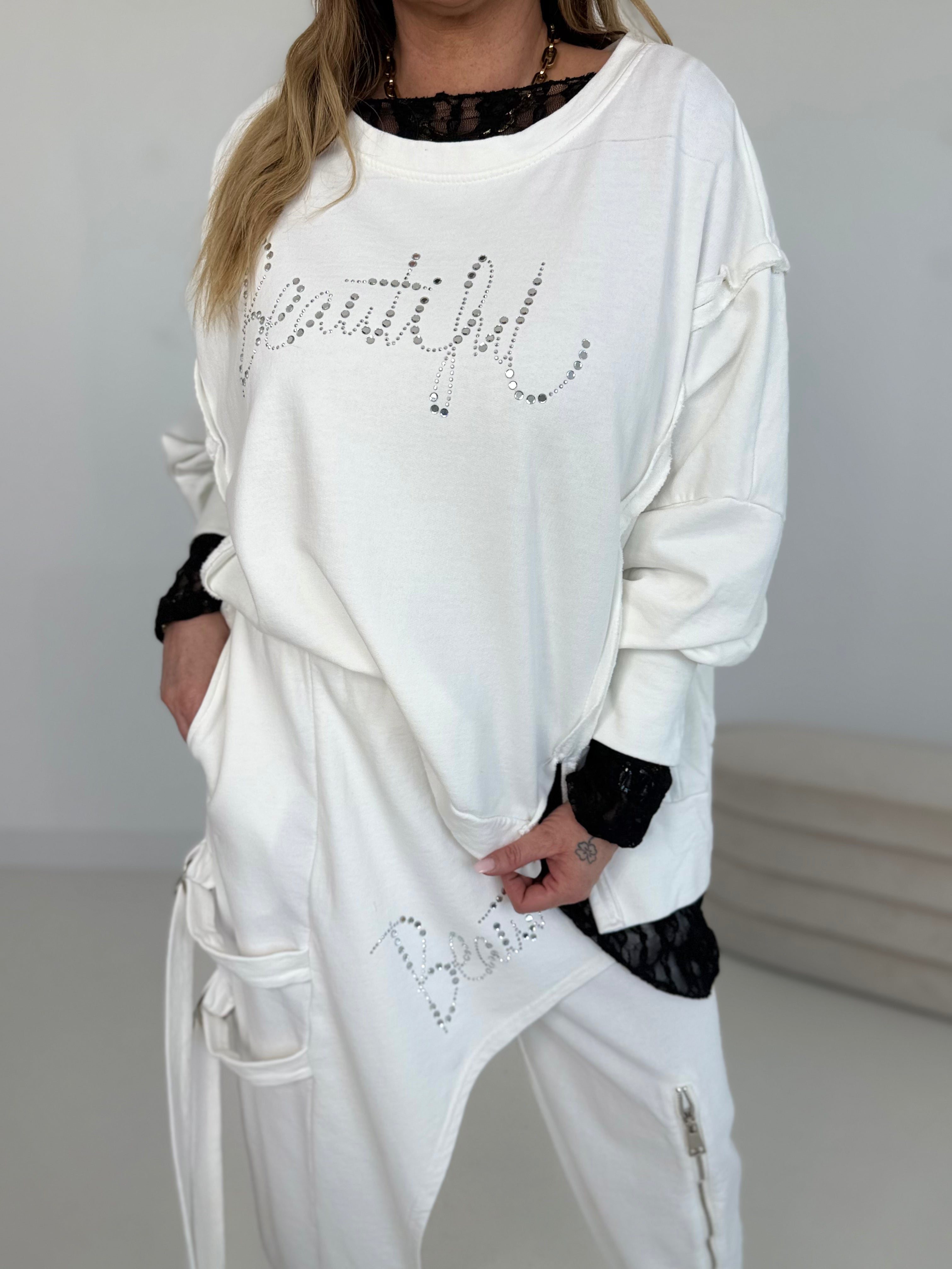 Napis z przodu z błyszczącymi kryształkami