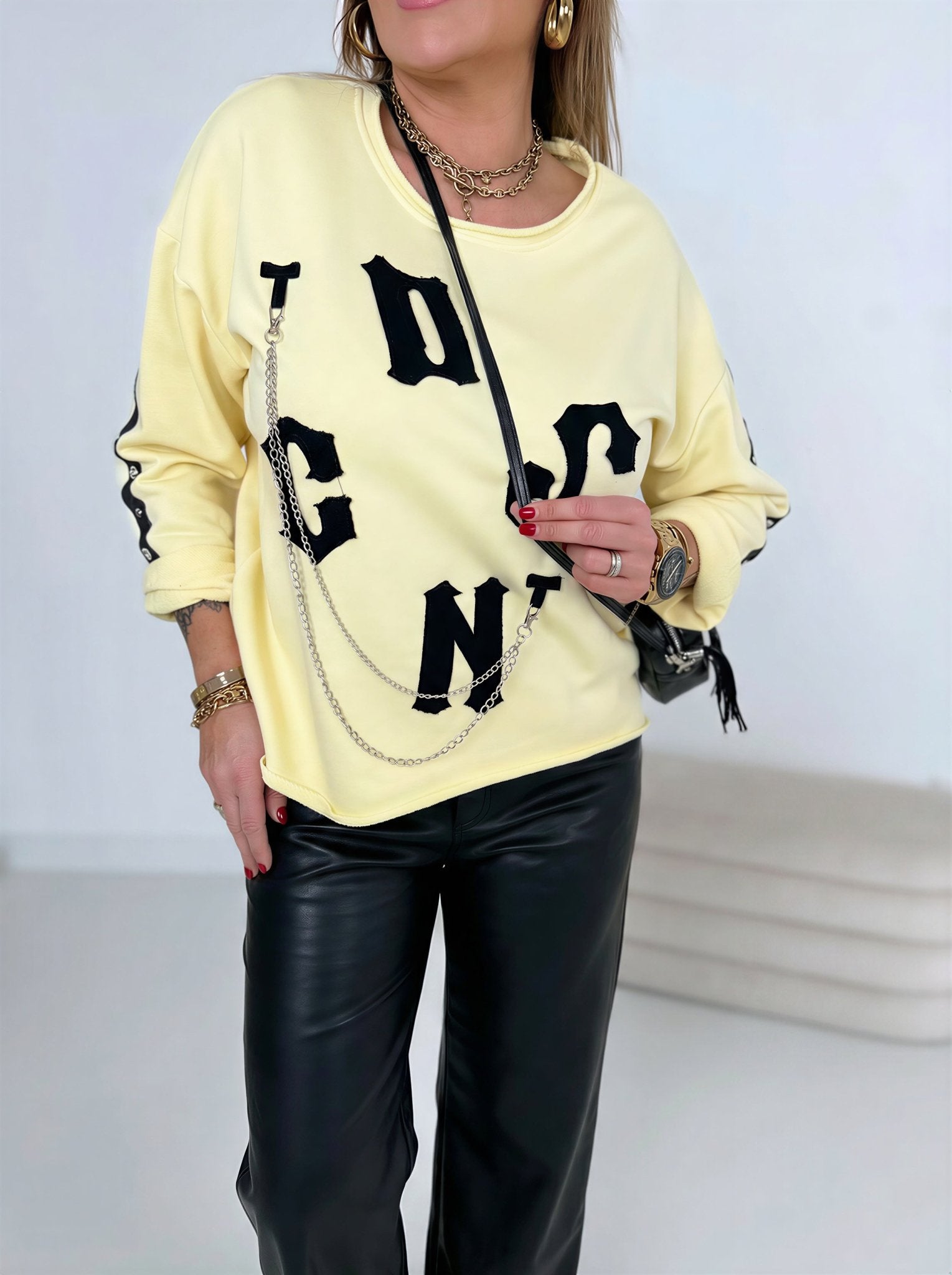 Farbe, Passform alles toll. Das Design ist sehr speziell, aber genau das finde ich toll. Die Buchstaben fusseln etwas. Habe das Sweatshirt noch nicht gewaschen und hoffe , daß die Buchstaben nicht zu viel Fäden verlieren. Ich kaufe gern bei Euch....liebe diese farbenfrohe und etwas verrückte Mode.