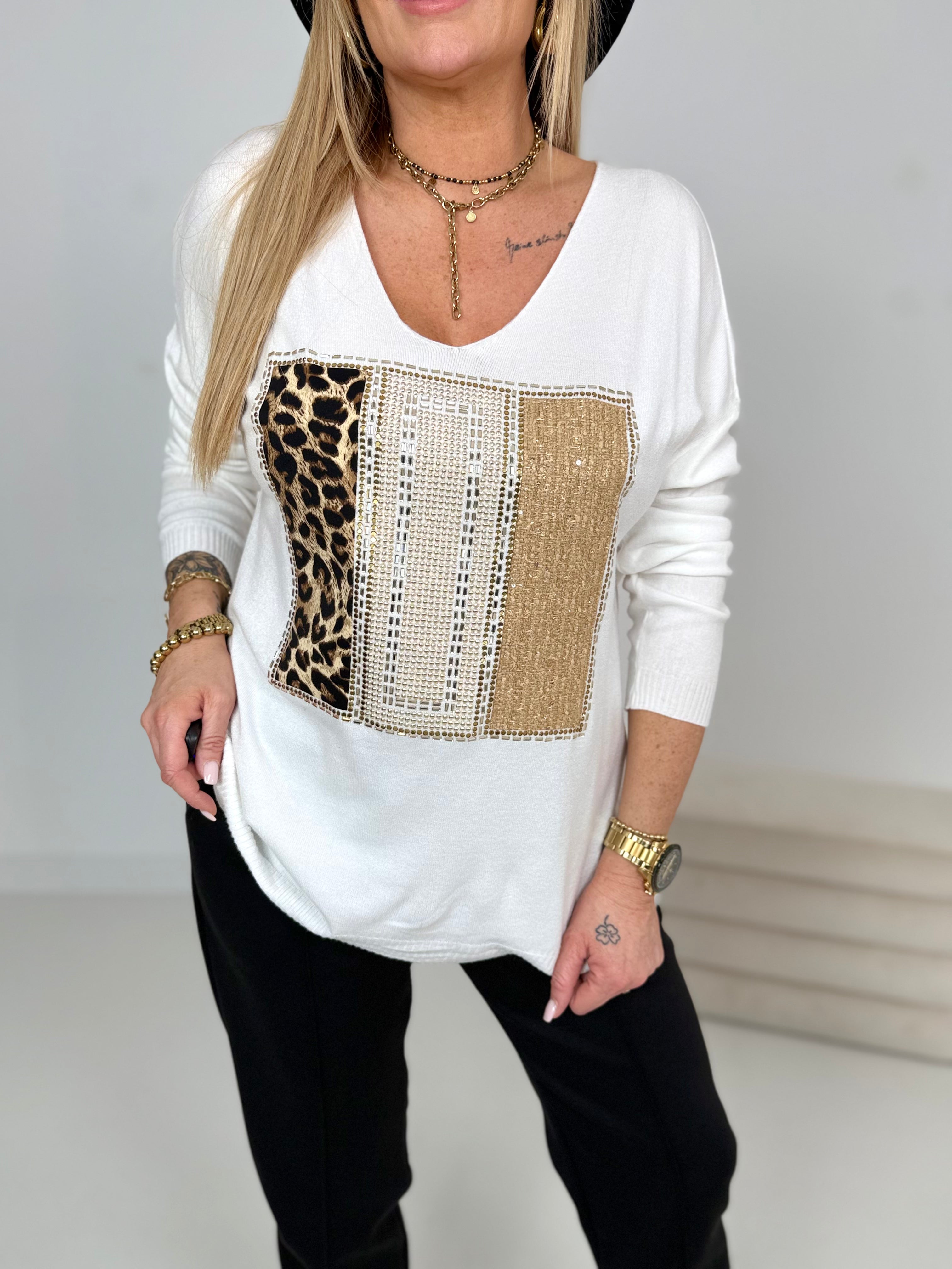 Nadruk z przodu z błyszczącymi kamieniami w kolorze srebrnym i złotym &Wzór Lwa