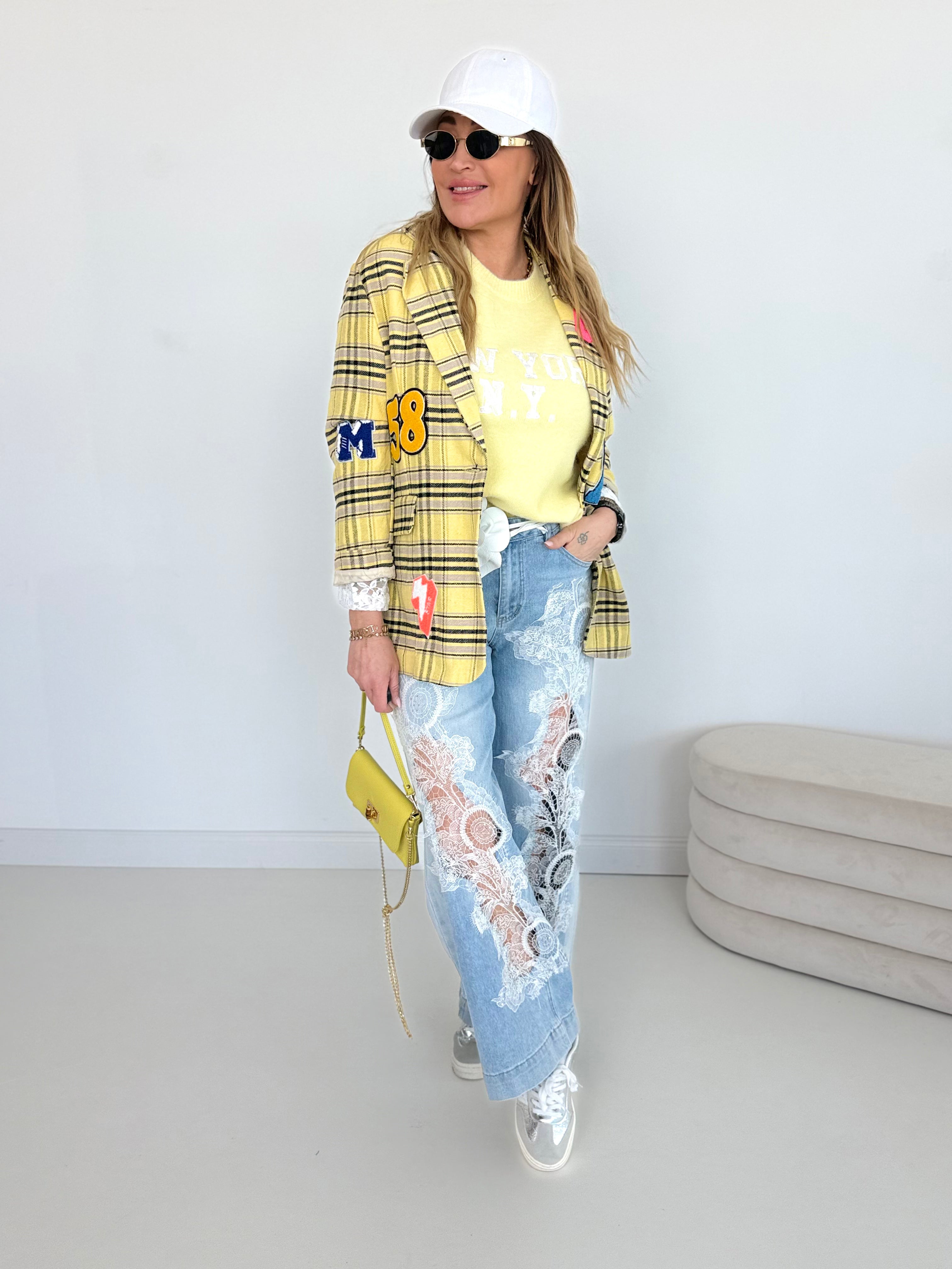 Vorne mit auffällig genähten Patches