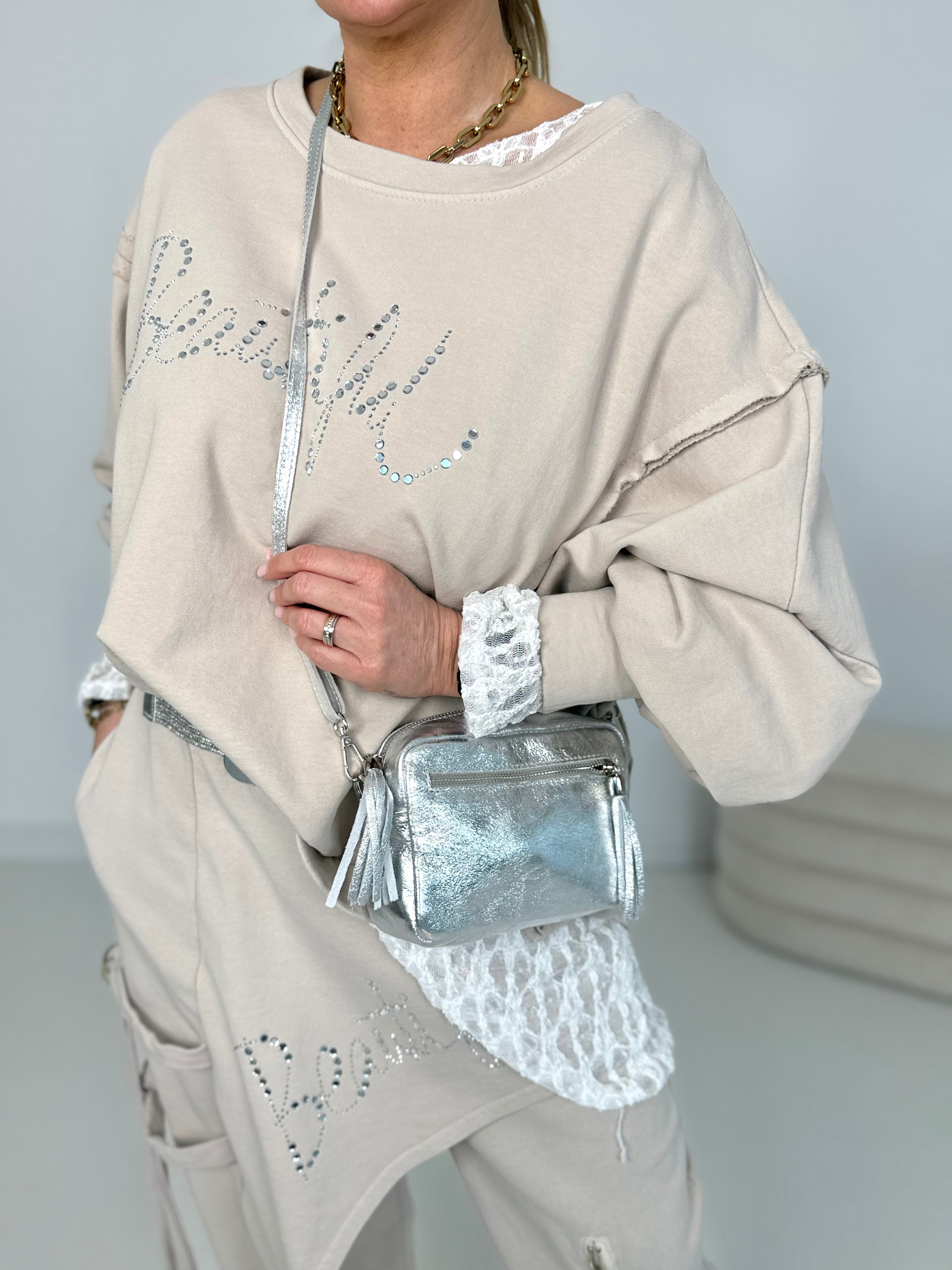 Napis z przodu z błyszczącymi kryształkami